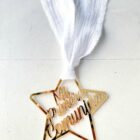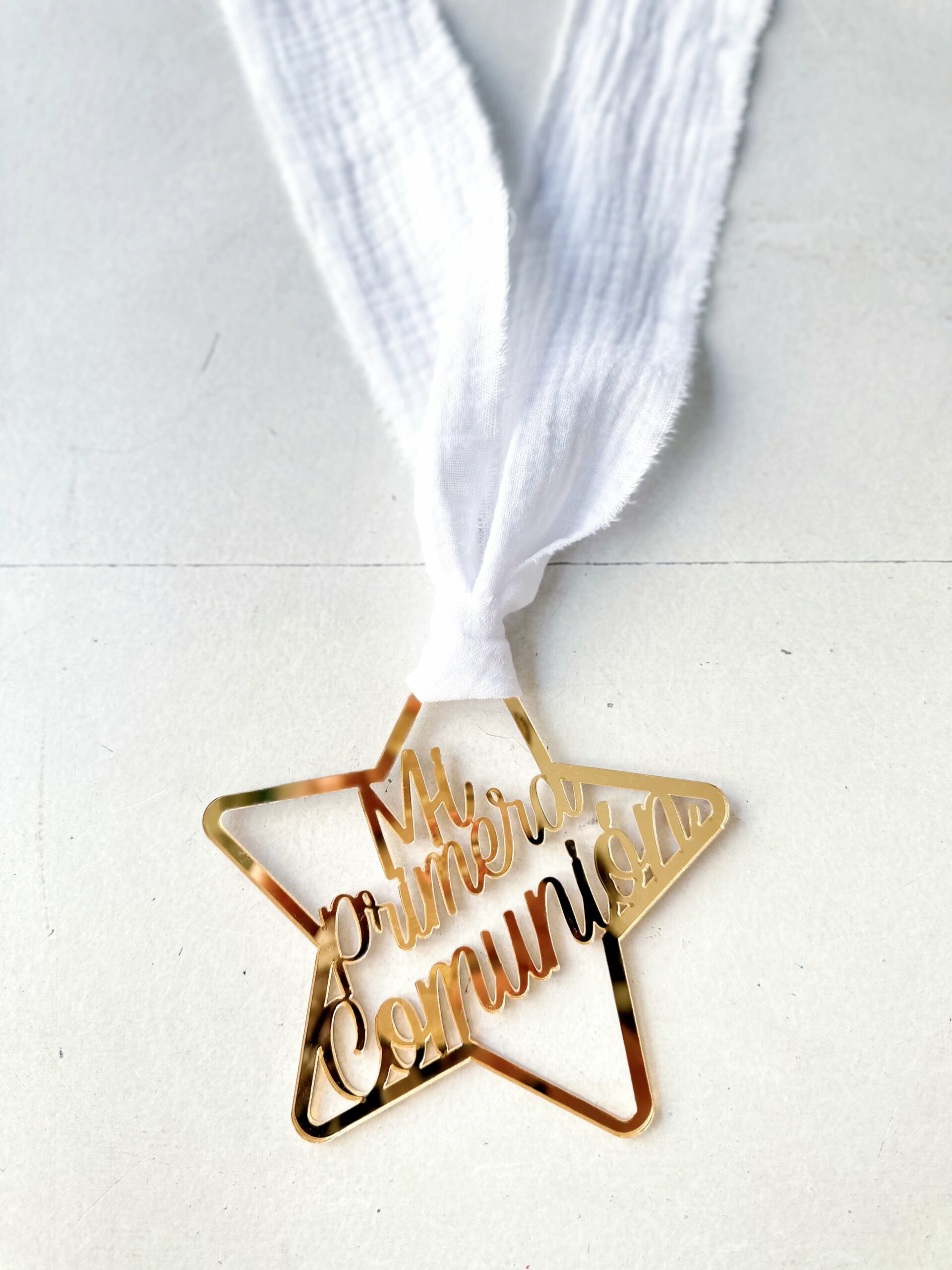 Un recuerdo mágico para ese día tan especial, medalla con forma de estrella con el texto mi primera comunión, decorada con un pequeño retal de tela. Mide aproximadamente 13cm.