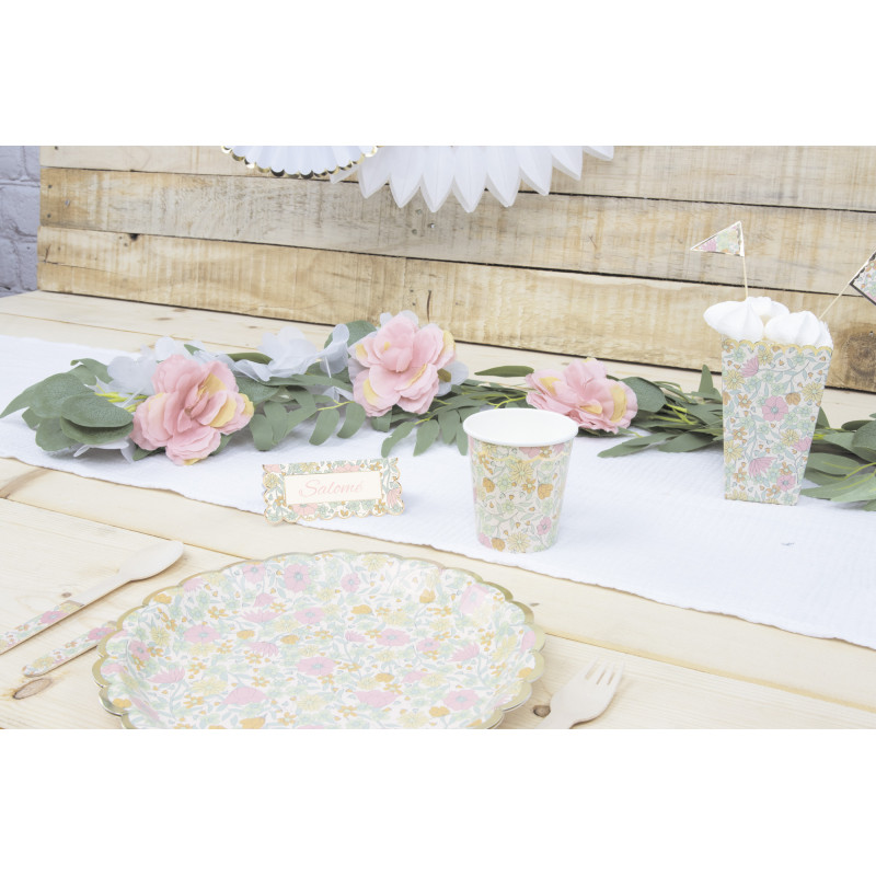 8 marcadores de sitio estampado con flores, con el borde festoneado en color dorado. Mide 8.3×9.5cm desplegado. Estos bonitos marcadores aportarán un acabado delicado a tus mesas.