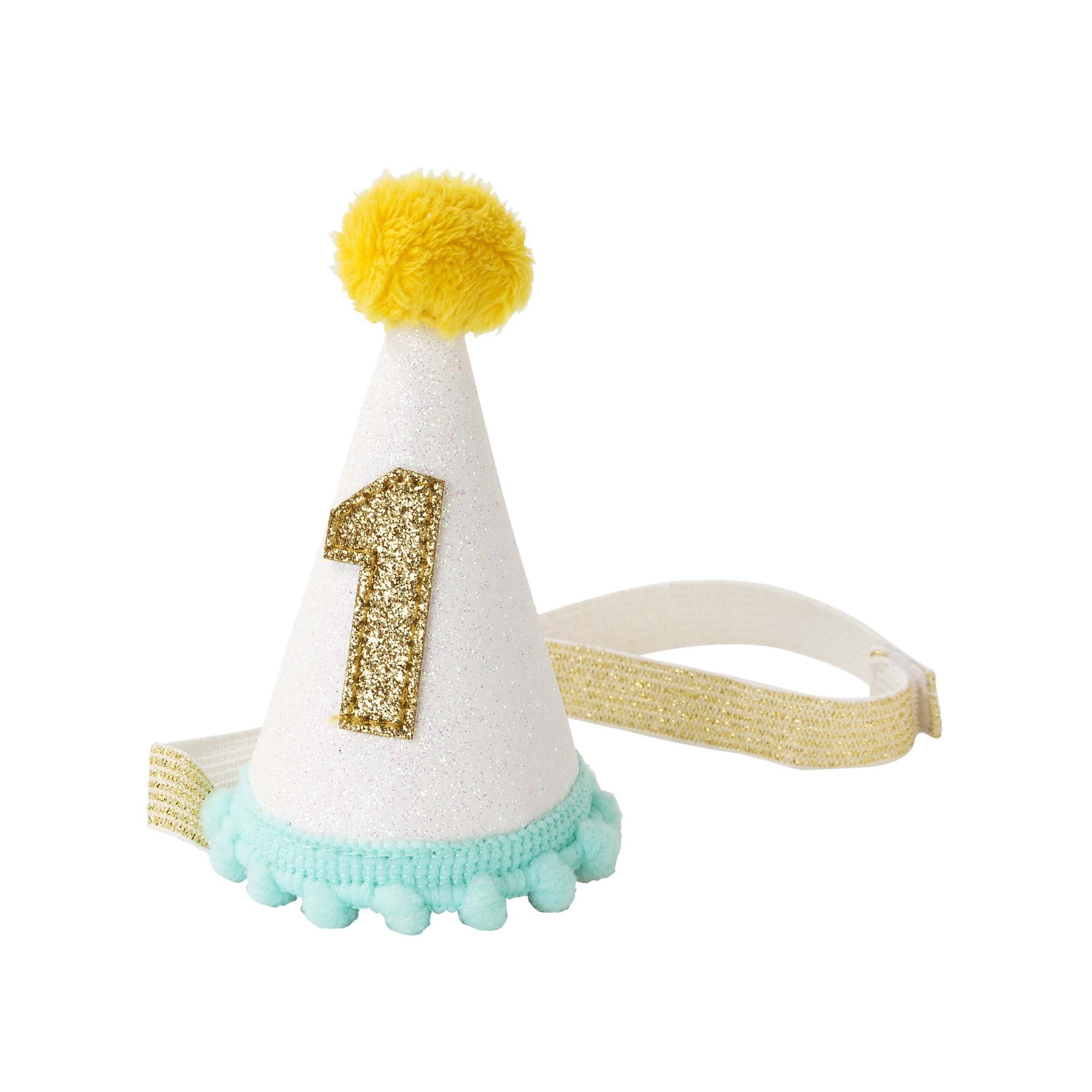 Mini gorro con elástico para el primer cumpleaños. Color blanco con purpurina, número 1 en dorado, pompón amarillo en la punta y borlitas en verde agua en la base.