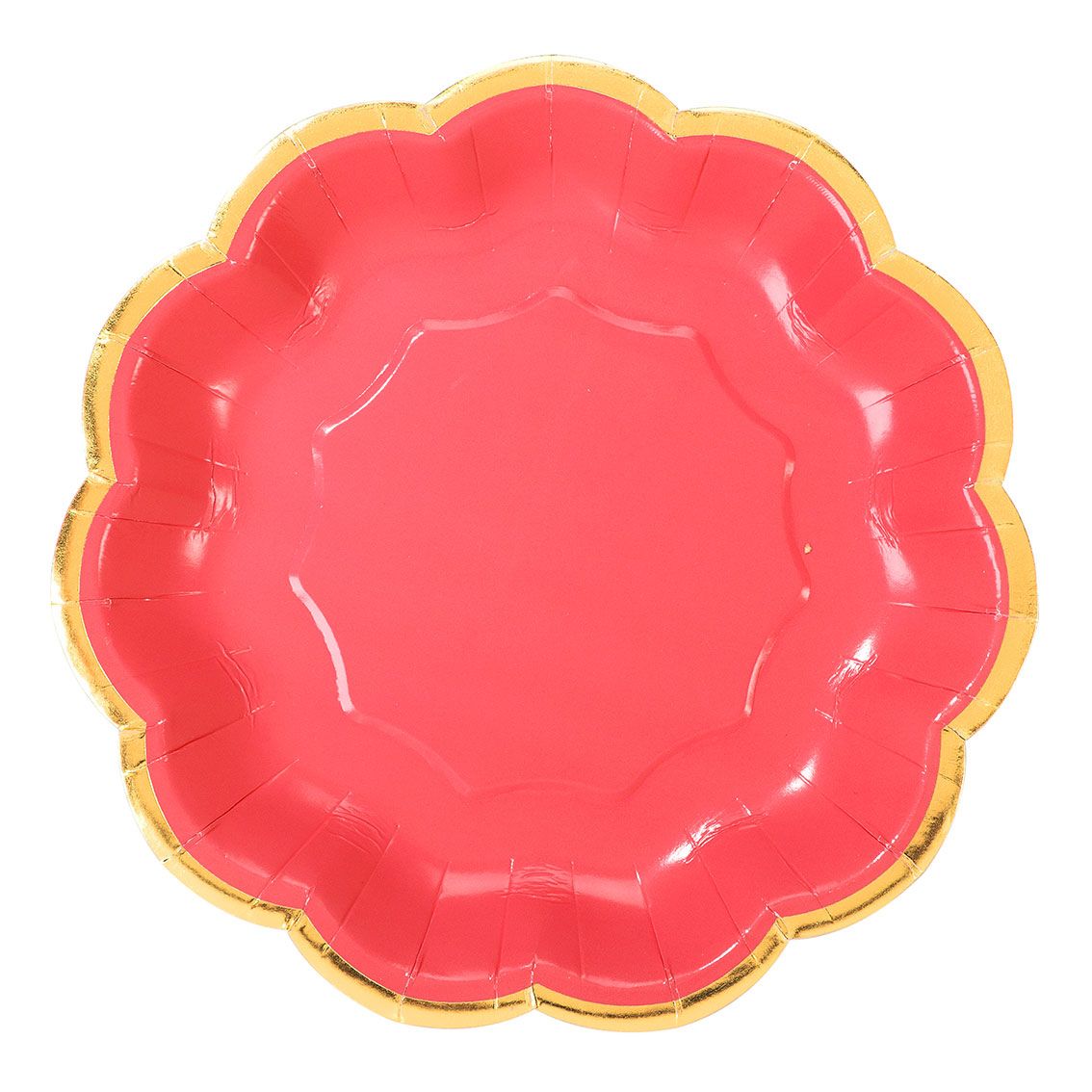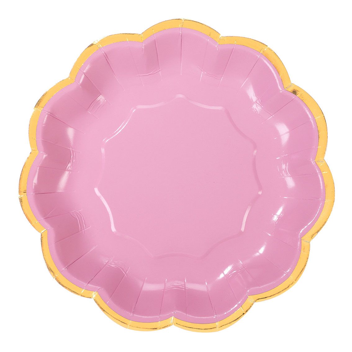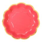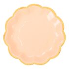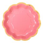 Pack de 12 platos de papel pequeños de 18cm de diámetro, surtido en 4 colores: rosa palo, rosa, coral y beige, con el borde haciendo ondas y decorado en dorado.