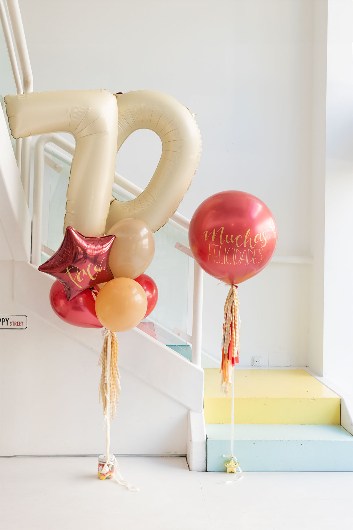 •  Un ramo de globos de helio compuesto por dos números de foil de 60cm color crema, un globo de foil con forma de estrella de 40cm, 5 globos de látex de 28cm de colores, al final lleva un fleco que combinan con el ramo y todos van atados a un tarro de chuches.