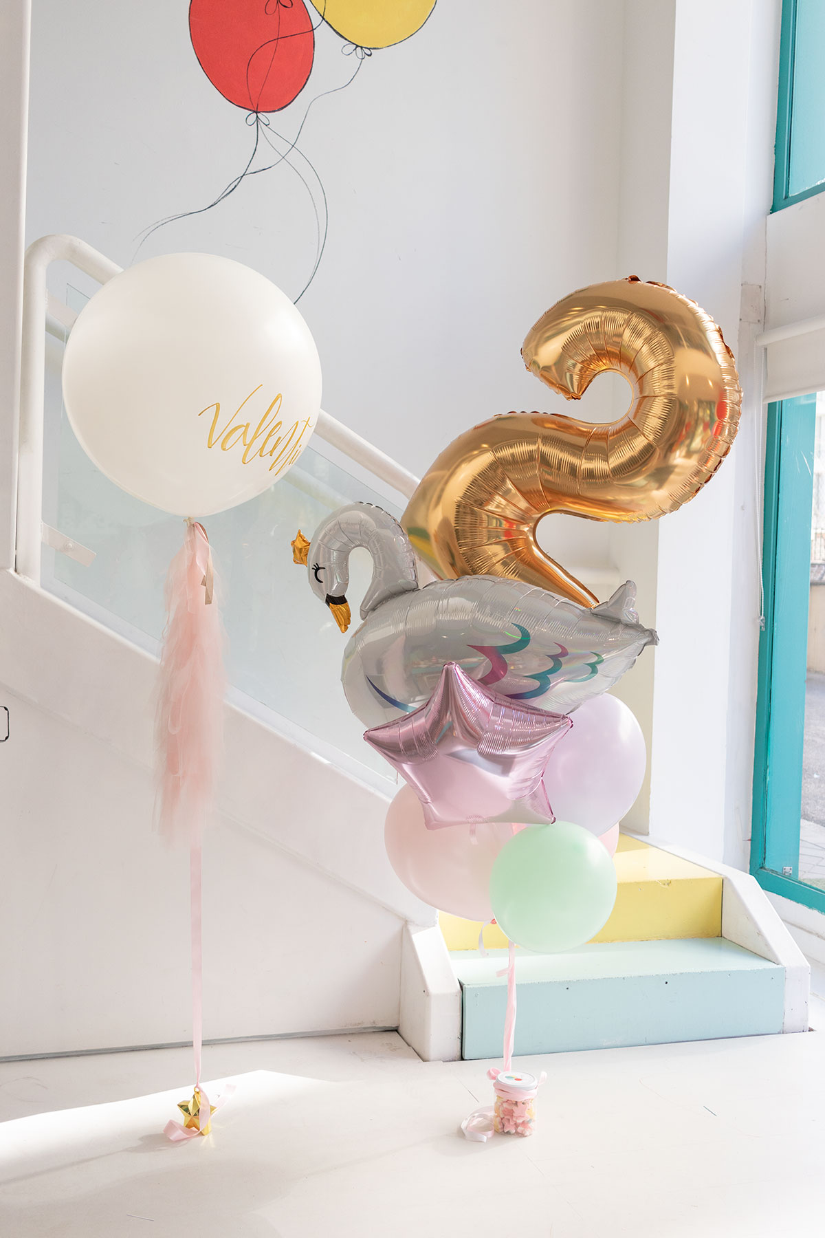 - un ramo de globos de helio compuesto por un número de foil de 90cm color dorado, un globo de foil con forma de cisne de 95cm en color blanco irisdiscente, un globo de foil con forma de estrella de 40cm y 5 globos de látex de 28cm de colores que combinan con el ramo, todos van atados a un tarro de chuches.