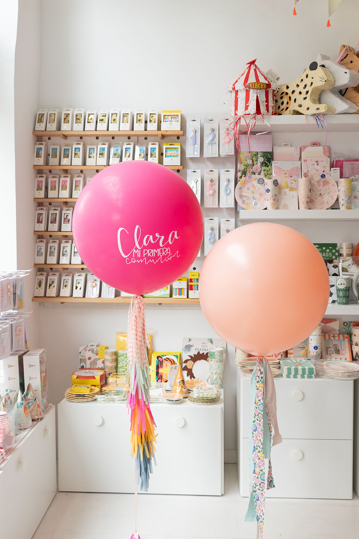 Pack de 2 globos redondos de látex biodegradable hinchados con helio. Uno mide 80cm y el otro 60cm, vienen decorados con flecos de papel seda y retales de tela. Podrás escoger la combinación que más te guste y personalizar el grande con el texto que quieras. Llevan pesos incluidos.