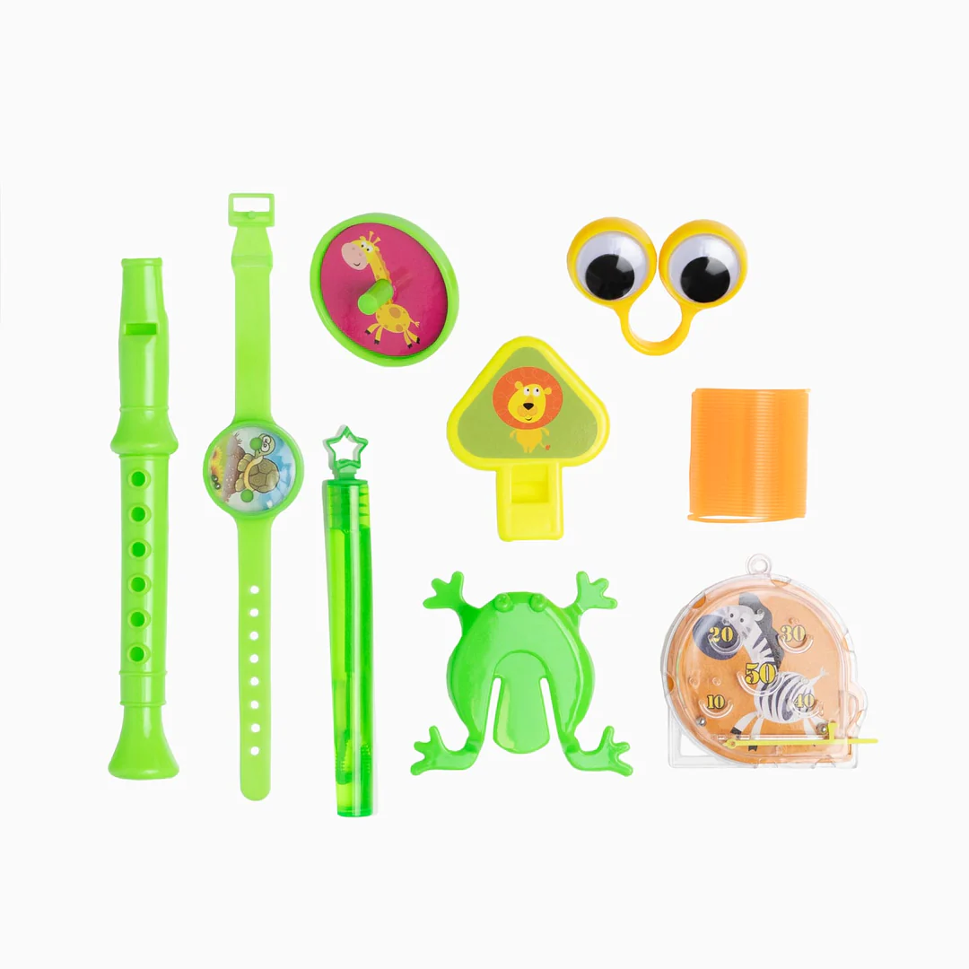 Surtido para piñata o para regalar a los invitados, incluye 2 pulseras, 1 flauta, 1 muelle, 1 pompero, 1 peonza, 1 rana saltarina, 1 silbato, 1 anillo y 1 laberinto