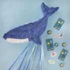 Piñata con forma de ballena hecha con papel seda y cartón. Mide aproximadamente 45x9x12 cm.