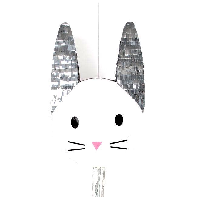 Piñata con forma de conejo que está hecha con papel seda, metalizado y cartón. Mide aproximadamente 37 x 38 x 12cm. Viene con tiras de colores decorativas.