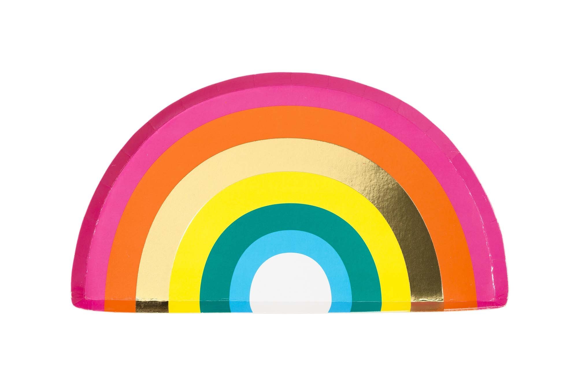 Pack de 12 platos desechables con forma de arcoiris en colores chillones y una franja en color dorado metalizado. Miden 14,5 x 26cm.