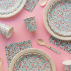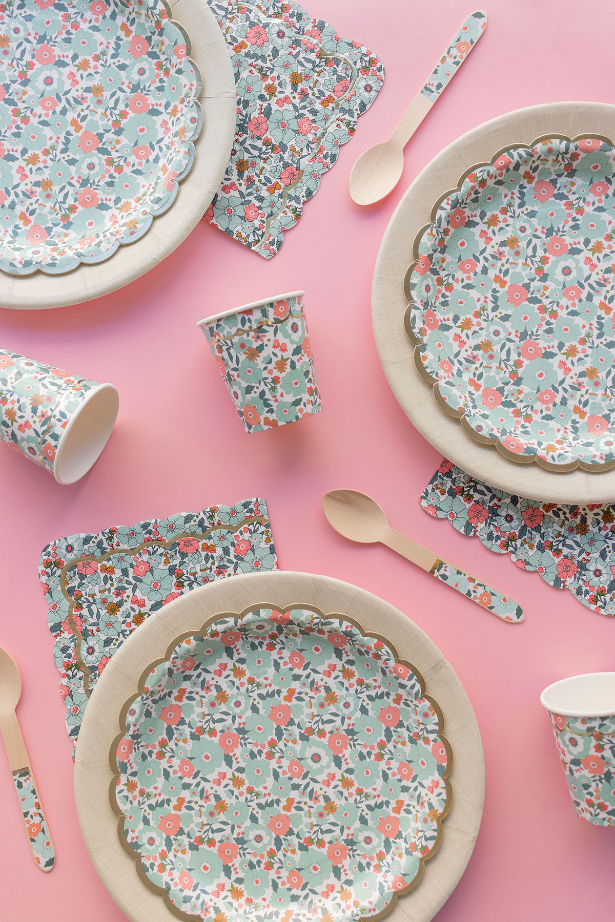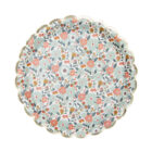 Pack de 8 platos con estampado de flores, con el borde festoneado en color dorado. Miden 23cm
