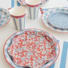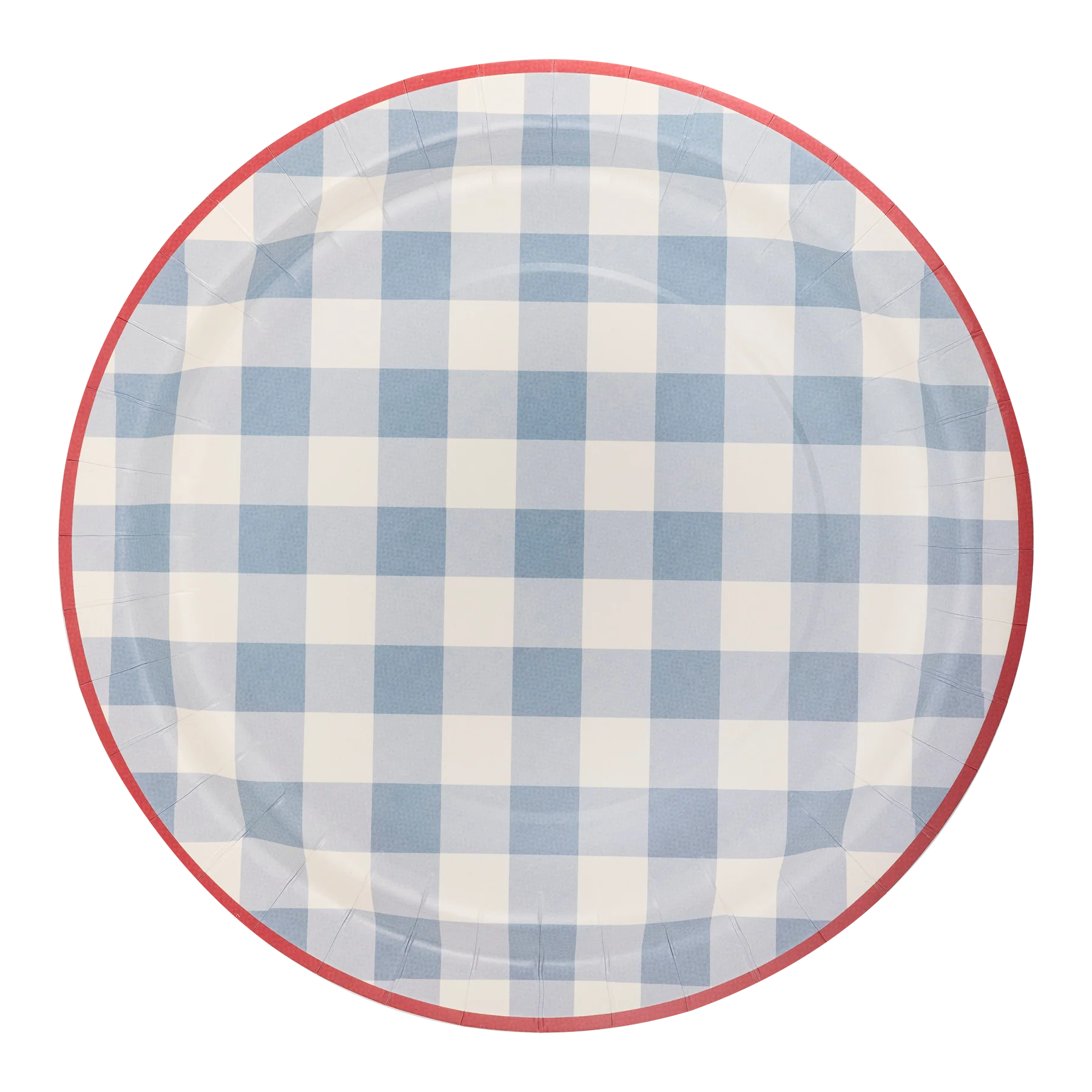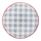 Pack de 8 platos con estampado vichy con el borde color rojo, miden 25cm de diámetro.