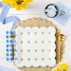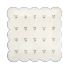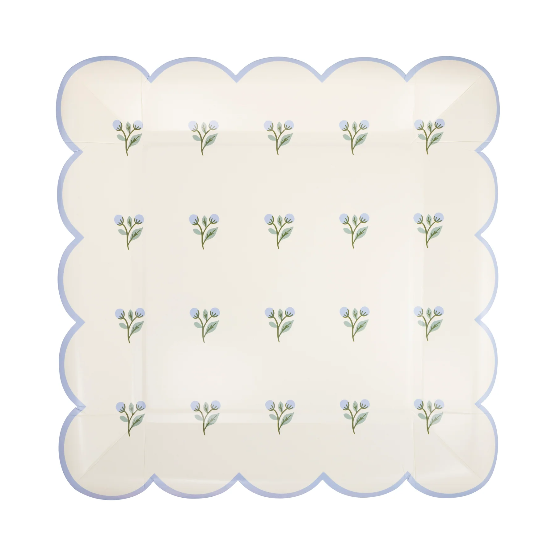 Pack de 8 platos cuadrados con estampado de flores, sobre fondo blanco, con el borde festoneado en azul clarito. Mide 25x25cm