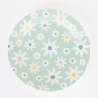 Pack de 8 platos de papel 100% ecológico de fondo verde menta estampado con margaritas de distintos tamaños y con el centro en distintos colores. Miden 22cm de diámetro.