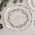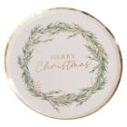 Pack de 8 platos de cartón redondos blancos estampados con una corona navideña verde y detalles dorados, llevan impresos MERRY Christmas también en dorado. Cada plato mide 25cm de diámetro.