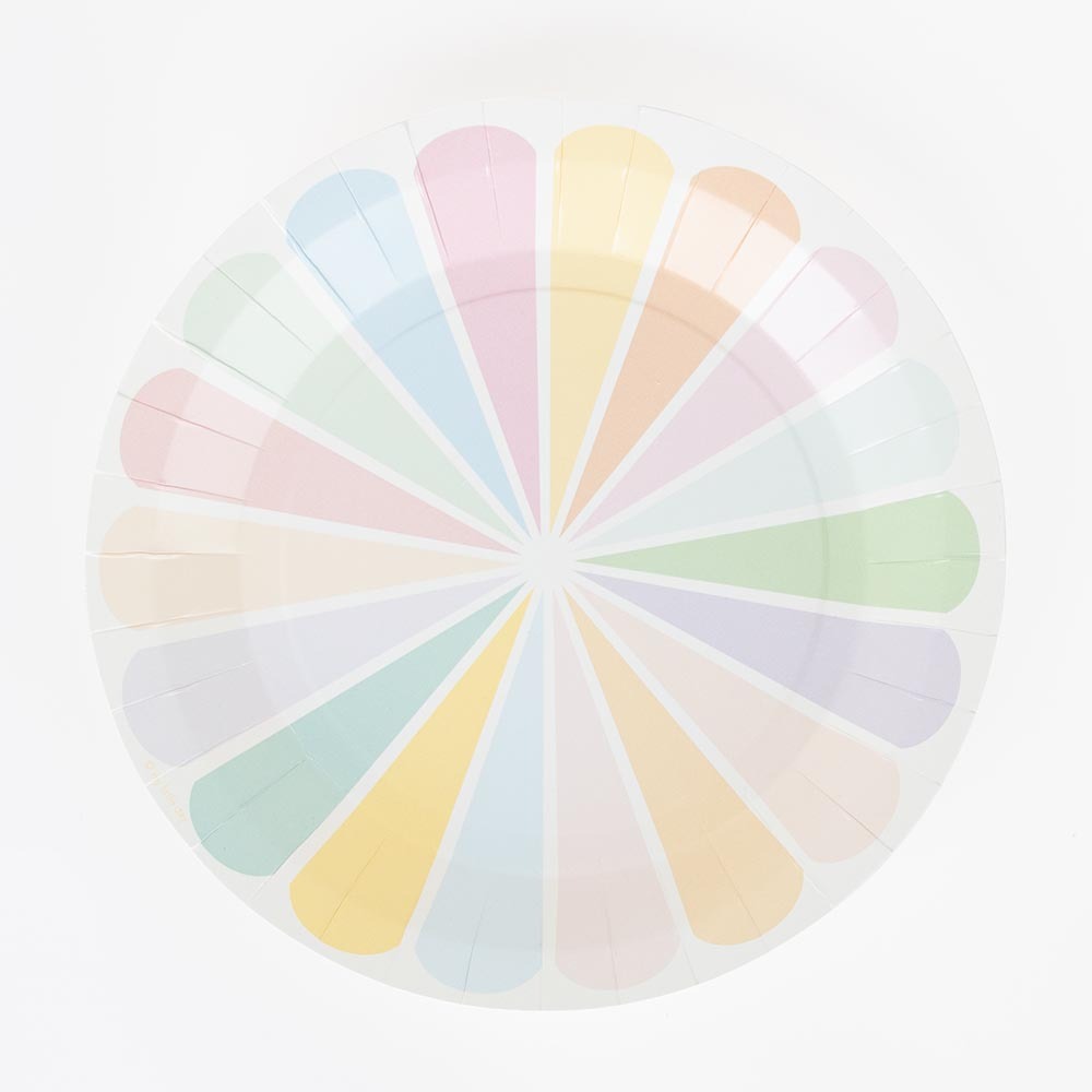 Pack de 8 platos de papel 100% ecológico de fondo blanco y estampado multicolor en tonos pastel. Perfecto para combinar con los demás productos de su colección así como la colección de flores pastel.