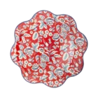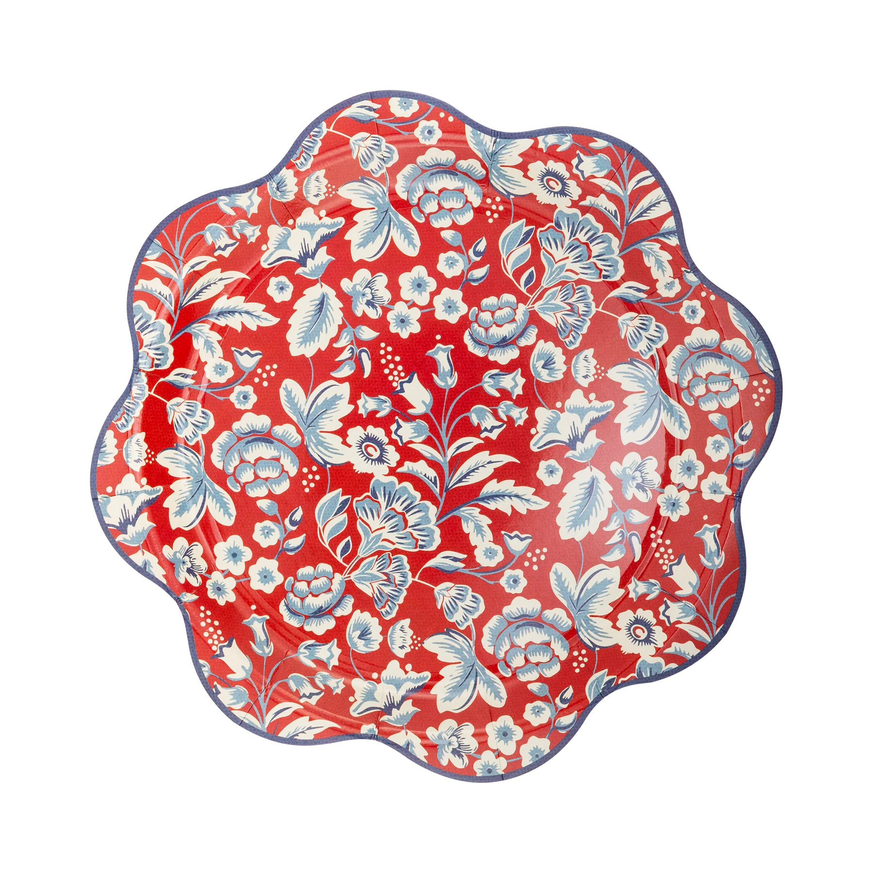 Pack de 8 platos con estampado de flores sobre fondo rojo con el borde festoneado en color azul. Miden 25 cm de diámetro