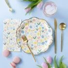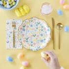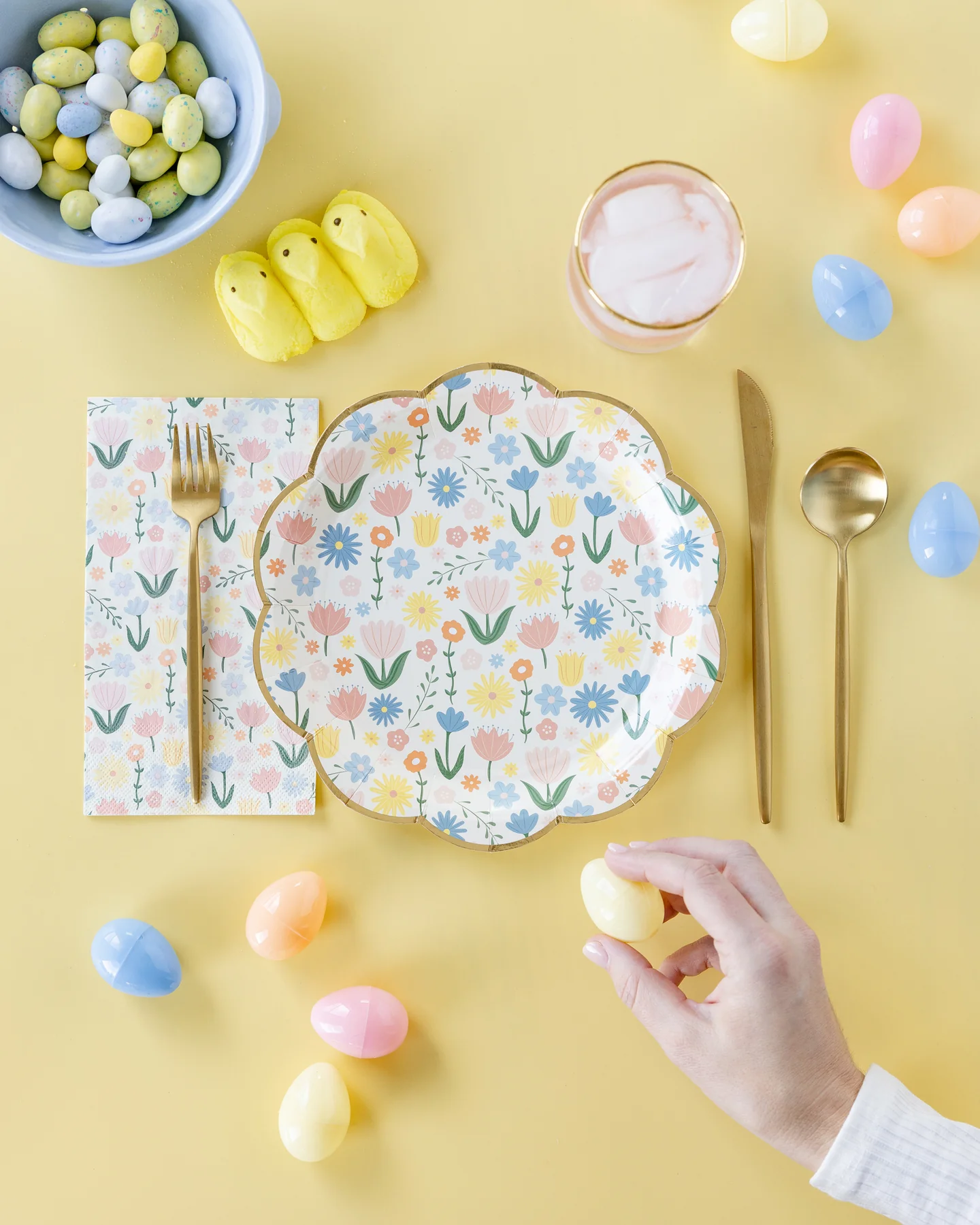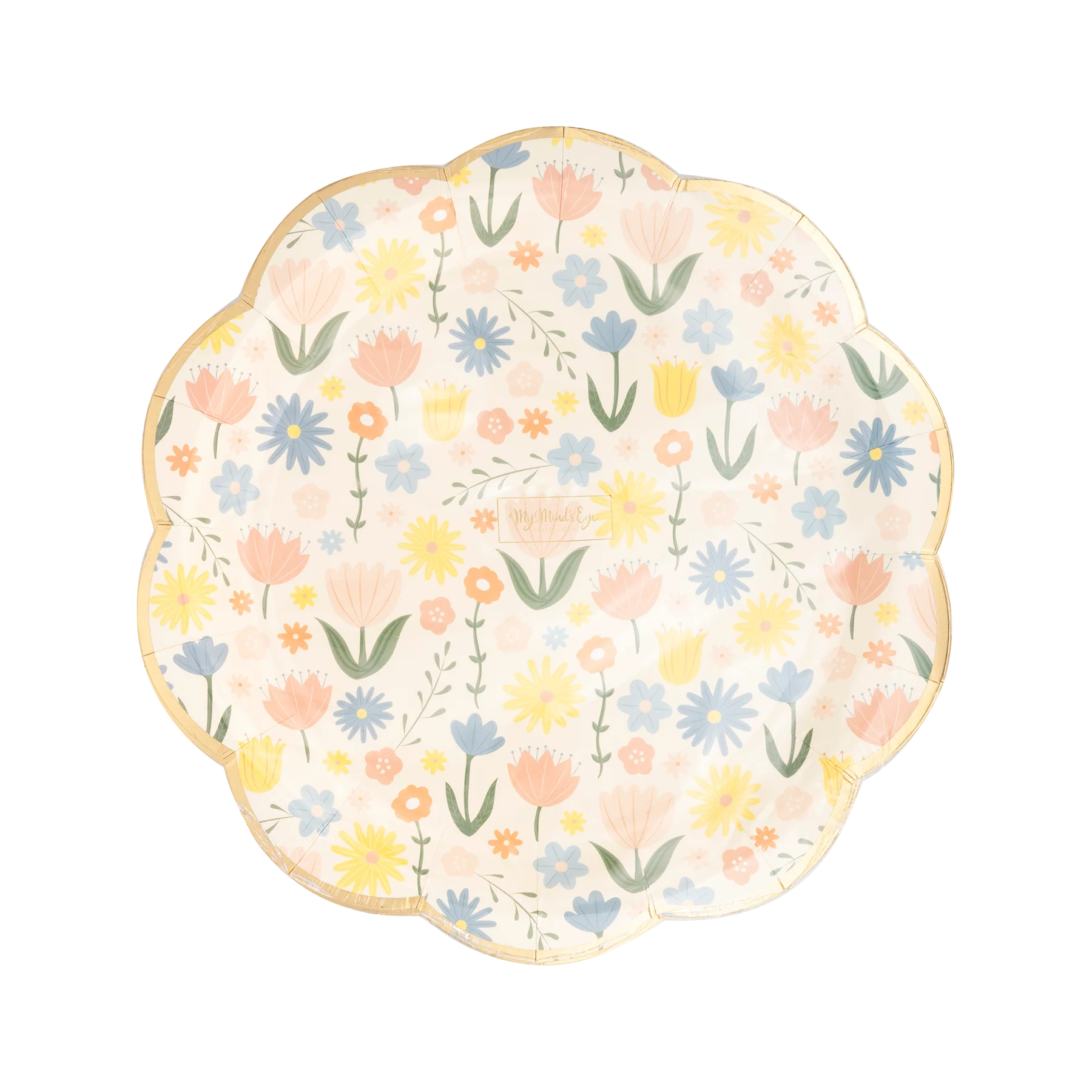 Pack de 8 platos con estampado de flores, sobre fondo beige con el borde festoneado en color dorado.