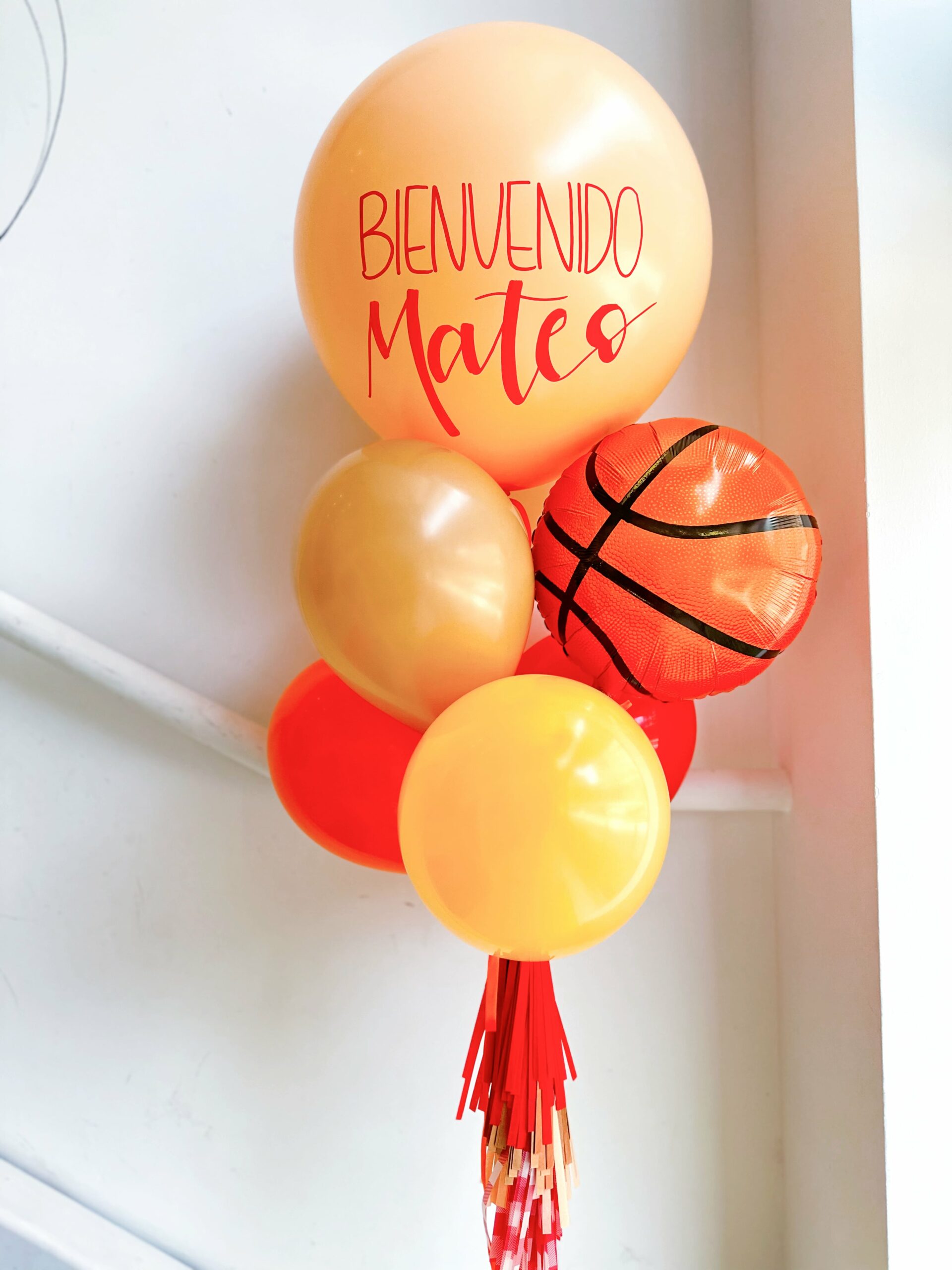 El ramo perfecto para los fanáticos del baloncesto. Está compuesto por un globo de látex de 60cm que podrás personalizar con el texto que quieras, un globo de foil metalizado con forma de balón y 5 látex de 28cm surtidos de color, decorados con flecos de papel. Puedes elegir el peso al que van atados.