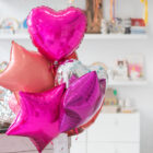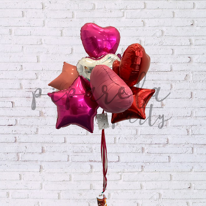 Ramo de globos hinchado con helio compuesto de 8 globos de foil metalizado con forma de corazones y estrellas de 40cm, todos atados a un tarro de chuches.