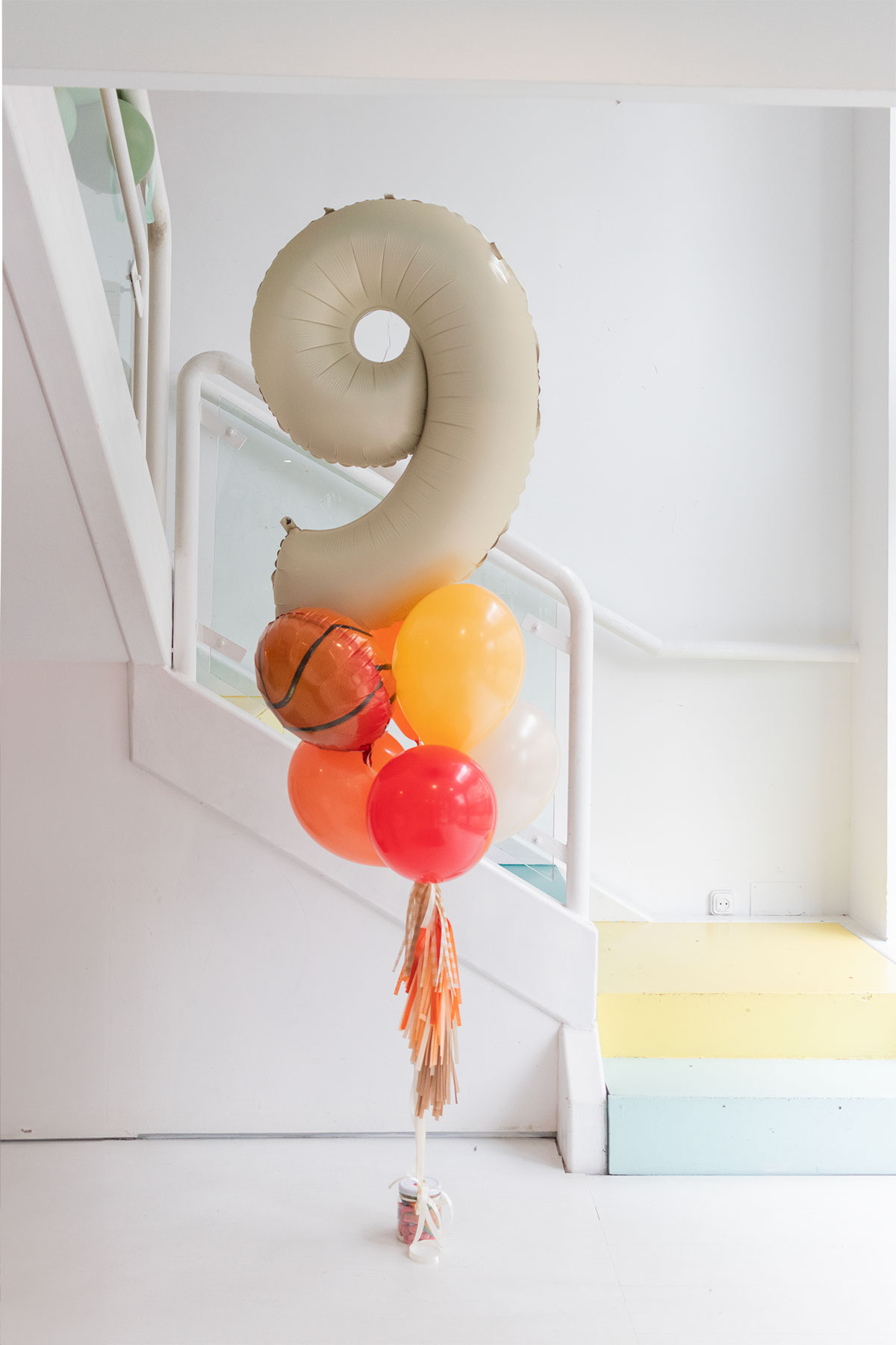 El ramo perfecto de globos perfecto para l@s adict@s al baloncesto, compuesto por un globo de foil con forma de número de 90cm en color crema, un globo de foil de 40cm con forma de pelota de baloncesto y 5 globos látex todos atados por flecos de papel seda a un tarrito de chuches.