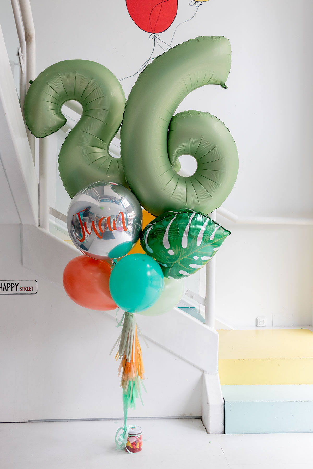 Ramo Feliz cumpleaños de globos hinchado con helio, compuesto por 2 globos de foil número oliva de 90cm, 1 globo esférico de foil de 40cm, 1 globo en forma de hoja de palmera,  y 5 globos látex multicolor, van decorados con flecos seda multicolor y atado a un tarrito de chuches. Podrás personalizar el globo esférico con el nombre que quieras.