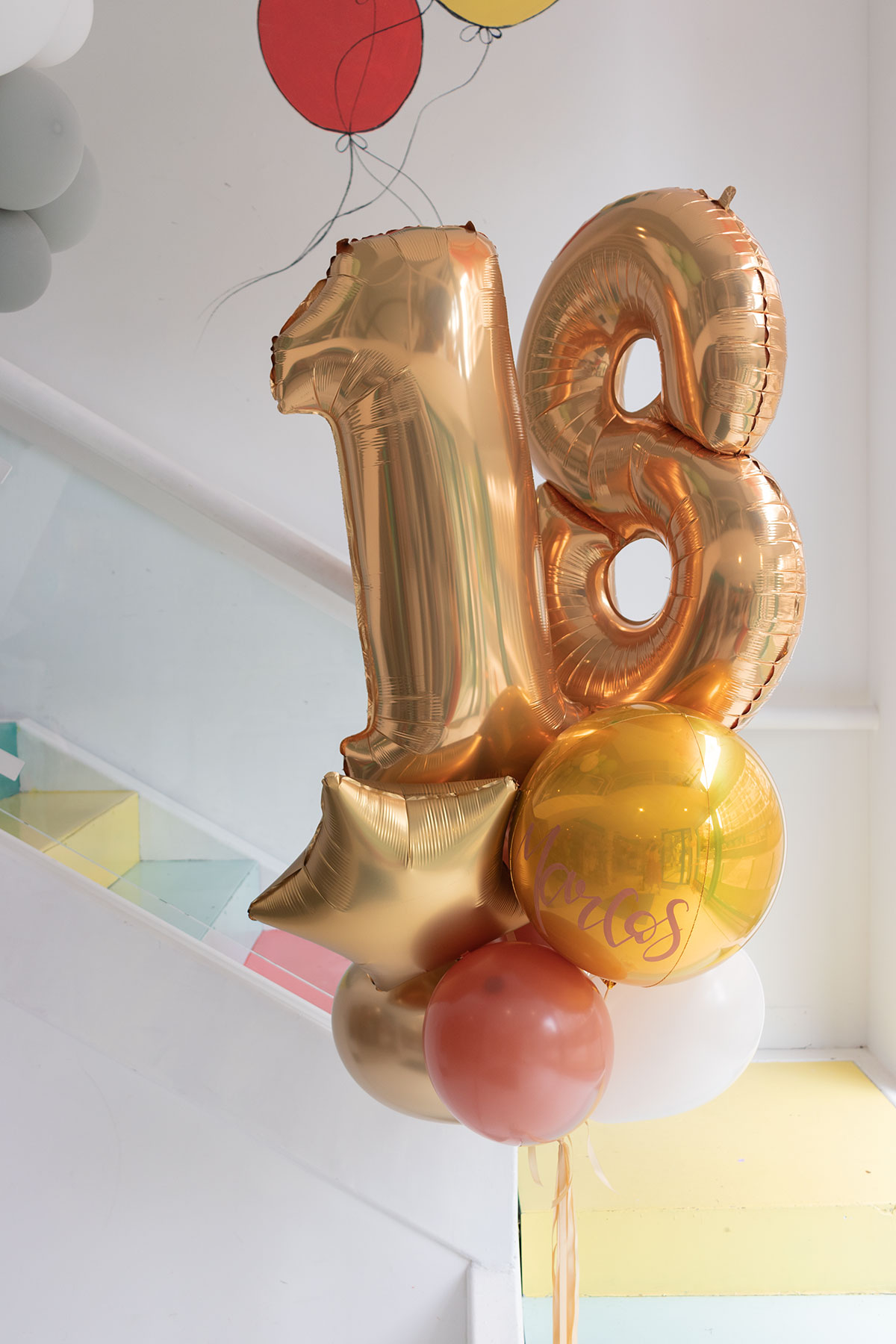 Ramo Feliz cumpleaños de globos hinchados con helio, compuesto por 2 globos de foil con forma de número número dorado de 90cm, una estrella de foil de 40cm, un globo esférico de foil de 40cm y 5 globos látex todos en tonos dorados, arena, terracota…, decorados con flecos de seda en los mismos tonos y van atados a un peso. Podrás personalizar el globo esférico con el texto que quieras.