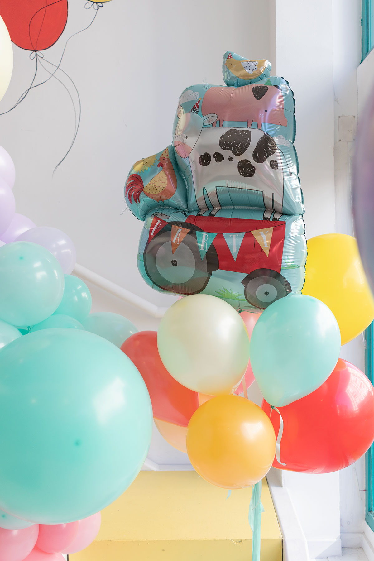 Bonito de ramo de la granja con un globo de foil metalizado con forma de tractor rojo con varios animales de la granja encima y va acompañado de 5, 10 o 15 globos de látex multicolor. Podrás elegir la pesa a la que van atados. Todos los globos están hinchados con helio.