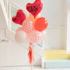 Ramo de globos hinchados con helio para cualquier ocasión, compuesto por 2 globos de foil con forma de corazón de 40cm, 5 globos látex todos en tonos rosa, rojo y coral… 5 látex estampados de corazones y decorados con flecos de seda en los mismos tonos, van atados a un tarrito de chuches. Podrás personalizar una de los corazones con el texto que quieras.