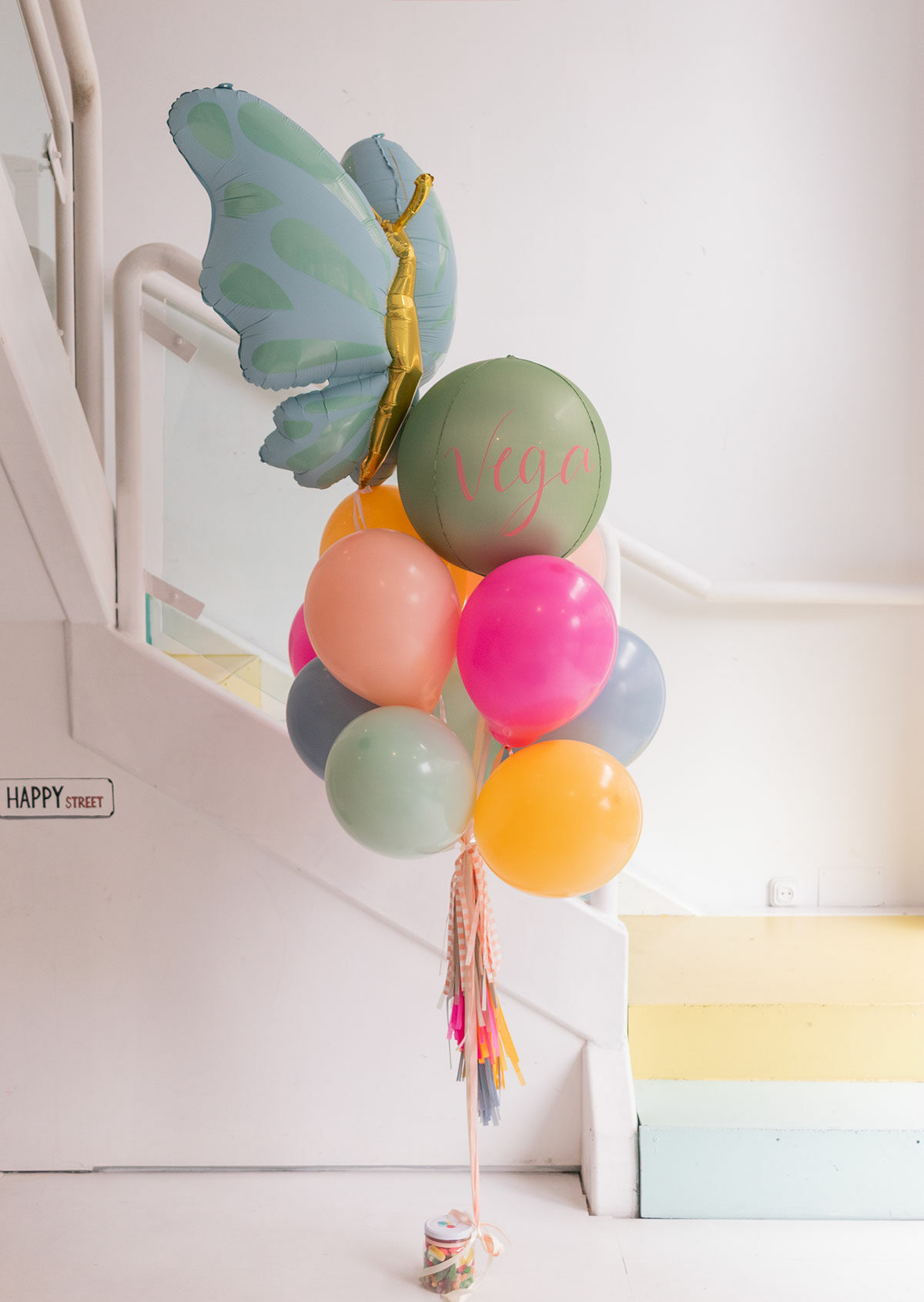 Ramo compuesto por un globo de foil metalizado de 80cm con forma de mariposa, 1 globo de foil de 40cm que podrás personalizar y 10globos de látex de 28cm, todos van decorados con flecos de papel y atados a un tarrito de chuches. El color de la mariposa varia según la combinación que elijas.