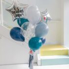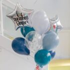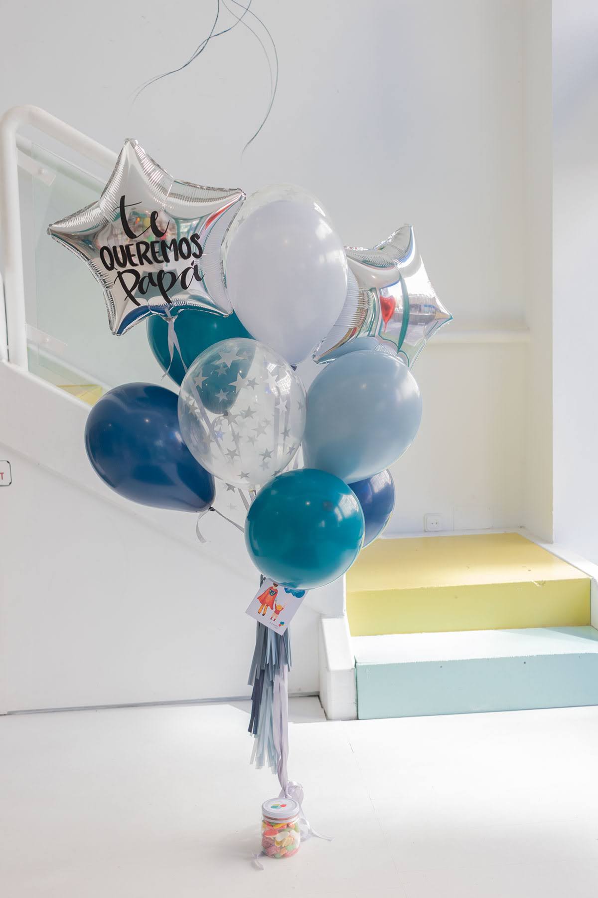 Ramo de globos hinchados con helio para cualquier ocasión, compuesto por 2 globos de foil con forma de estrella de 40cm, 5 globos látex todos en tonos azules, 5 látex estampados con estrellas plata y decorados con flecos de seda en los mismos tonos, podrás elegir el peso al que van atados. Podrás personalizar una de las estrellas con el texto que quieras.