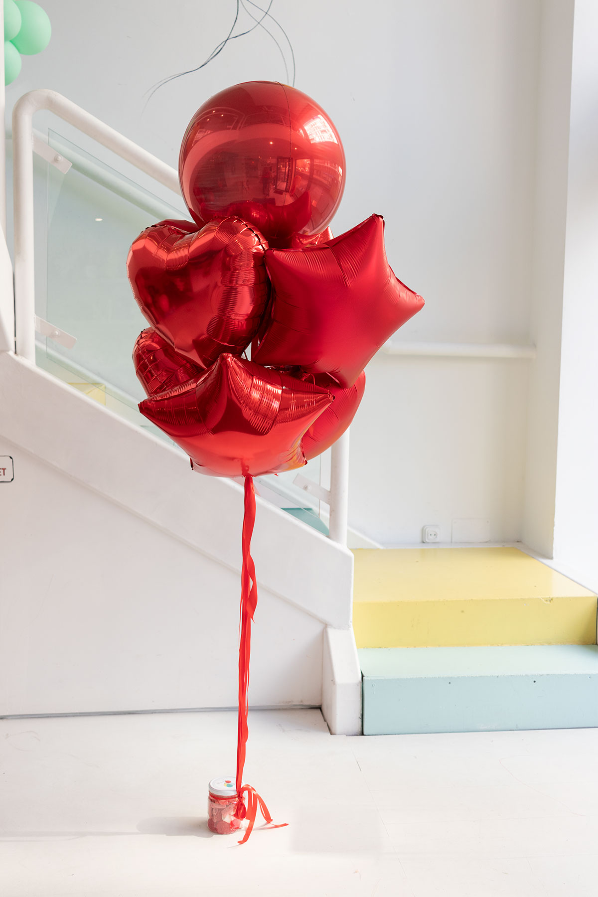 Todo al rojo con este ramo de globos de foil metalizado y mate en distintas formas: 1 bola de 40cm, 3 estrellas de 40cm y 4 corazones de 40cm, todos hinchados con helio y atados a un tarro de chuches.