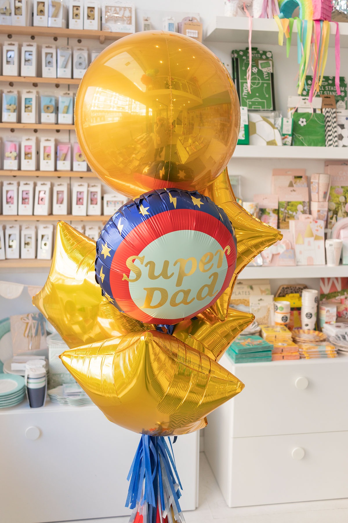 ‘Ramo de globos de foil metalizado hinchados con helio, está formado por un globo redondo de 40cm de color azul, rojo y menta y escrito en dorado Súper Dad, 4 estrellas doradas de 40cm y un globo esférico de 40cm que podrás personalizar con el texto que quieras. Todos van atadas con unos flecos de papel seda en los colores del ramo y podrás elegir el peso que quieras.