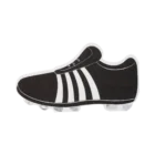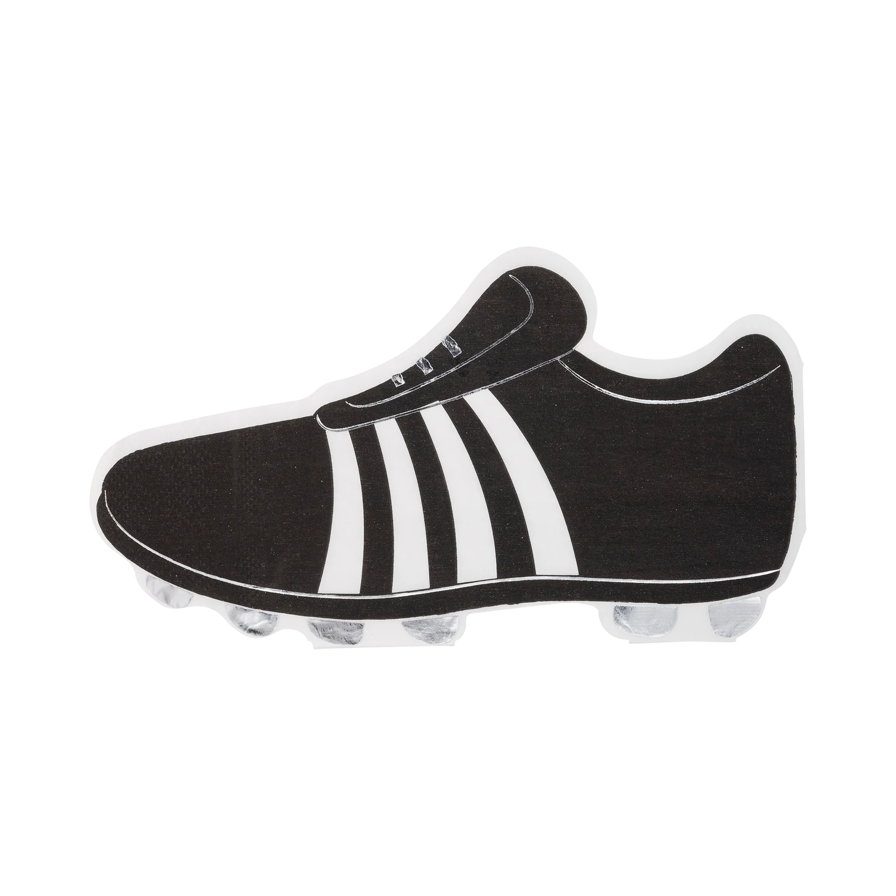 Pack de 18 servilletas con forma de bota de fútbol en color negro y plata, miden 17×9 cm aproximadamente.