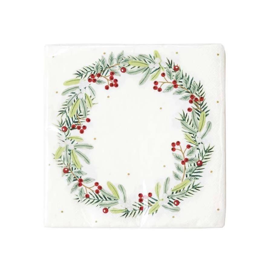 Pack de 20 servilletas tamaño lunch estampadas con una corona de navidad sobre fondo blanco. Tienen 3 pliegos que miden 33 x 33cm.