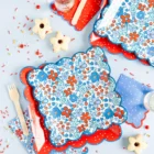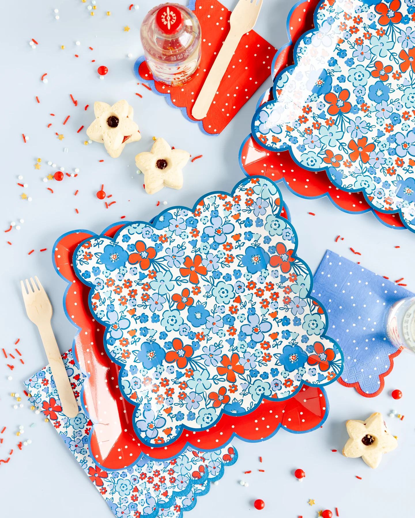 Pack de 24 servilletas con flores azules y rojas fondo blanco, con el borde ondulado en azul. Miden 11x19cm.