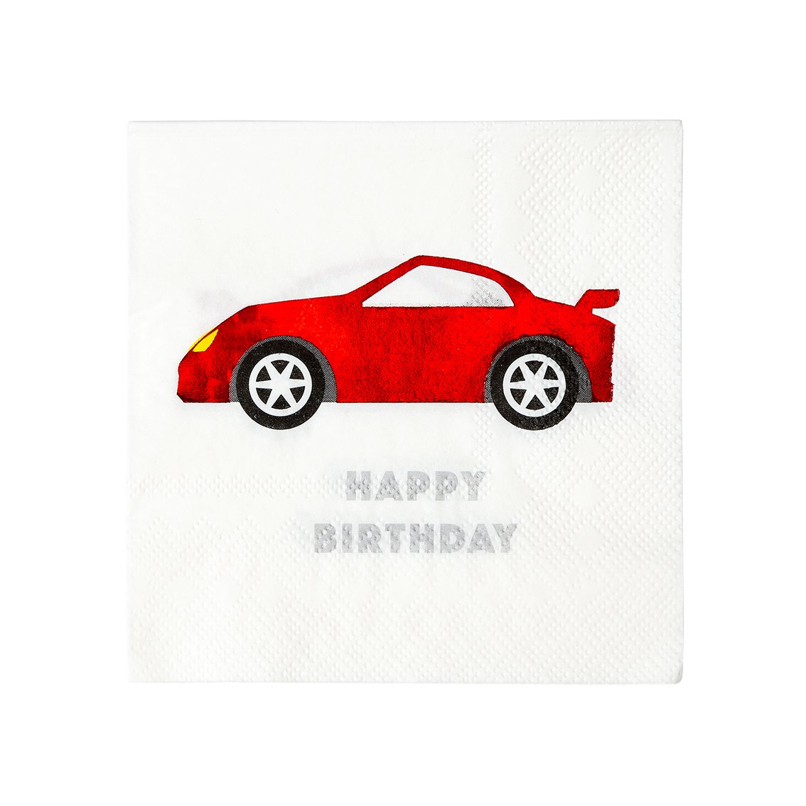 Pack de 16 servilletas tamaño cocktail 25x25cm, blancas estampadas con un coche rojo metalizado y el texto Happy Birthday en gris.
