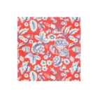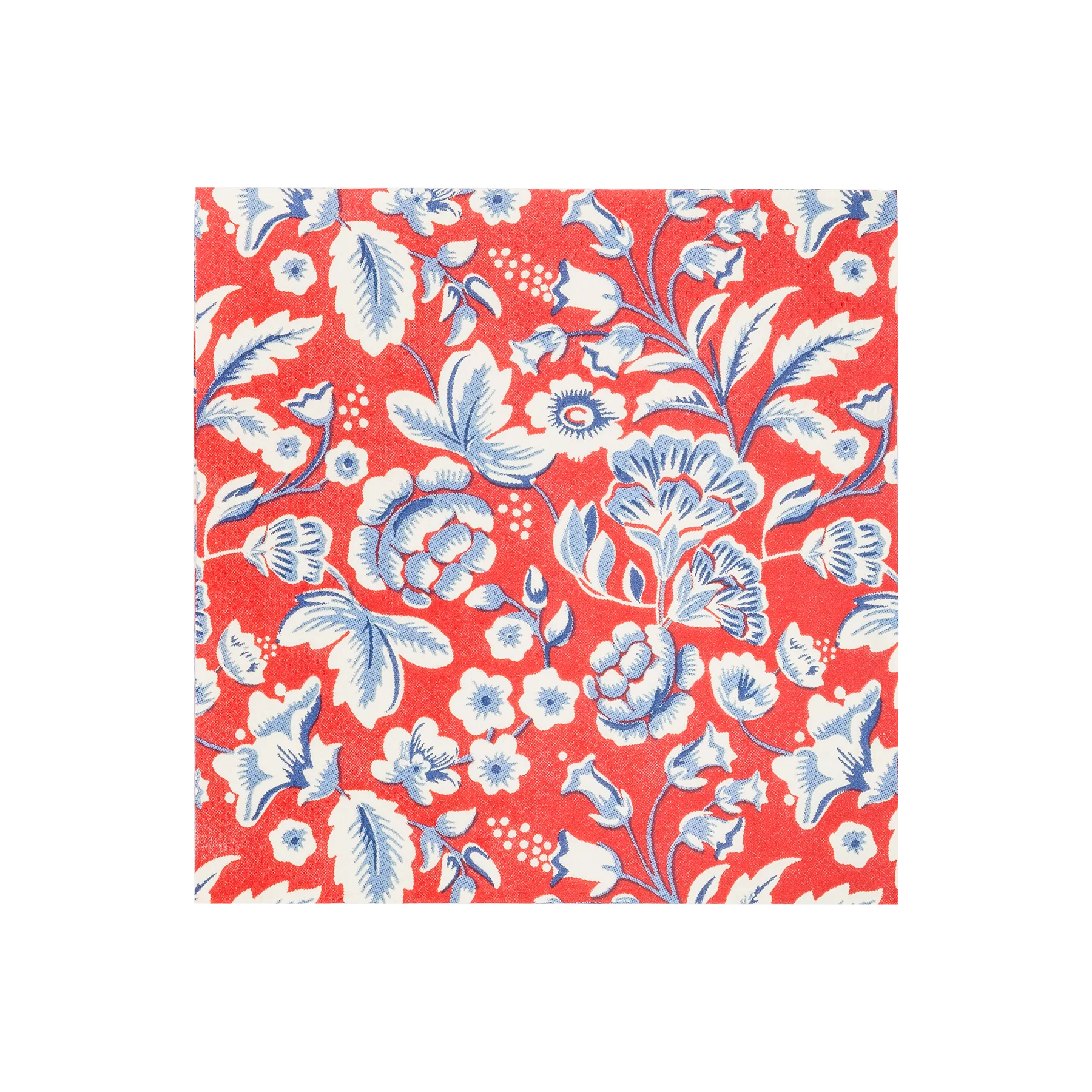 Pack de 24 servilletas de papel tamaño cocktail con flores y hojas azules sobre fondo rojo que miden 12x12cm.