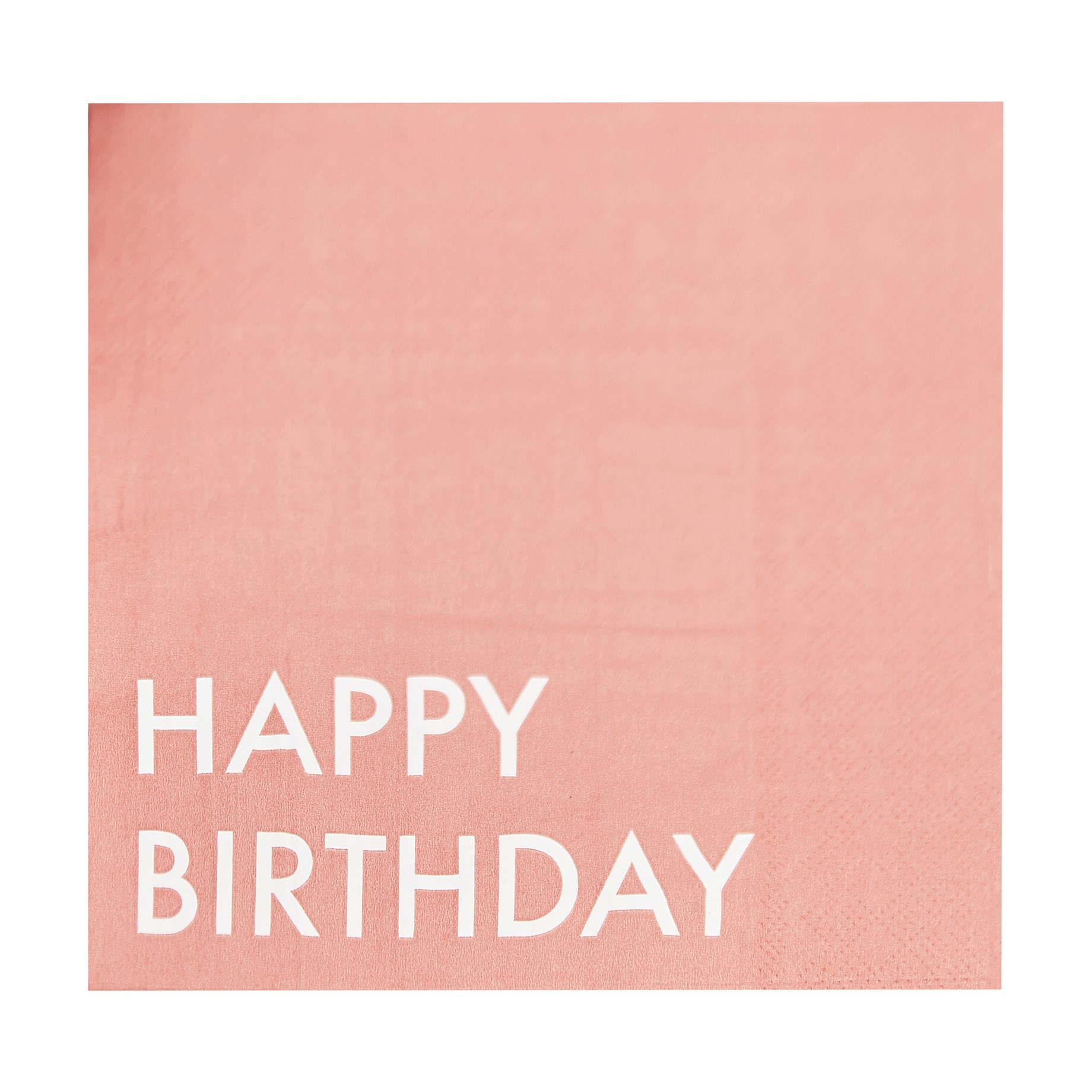Pack de 16 servilletas de papel en color coral con el texto HAPPY BIRTHDAY en blanco. Miden 16,5cm x 16,5cm. Tanto las servilletas como su empaquetado son reciclables y tienen certificado FSC.