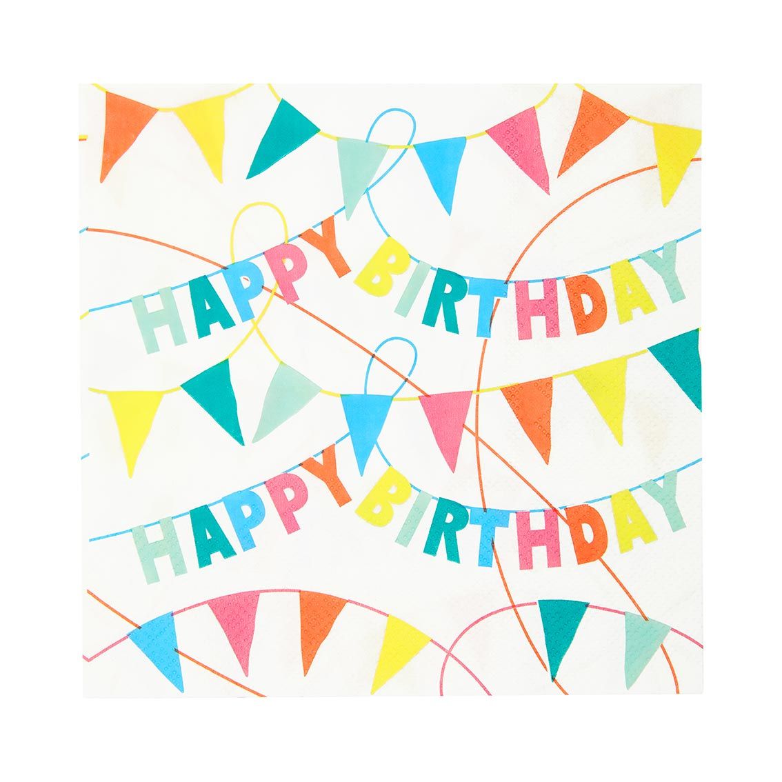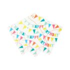 Pack de 20 servilletas de papel reciclado con fondo blanco y estampado de banderines multicolor y texto Happy Birthday. Desplegadas miden 33x33cm.