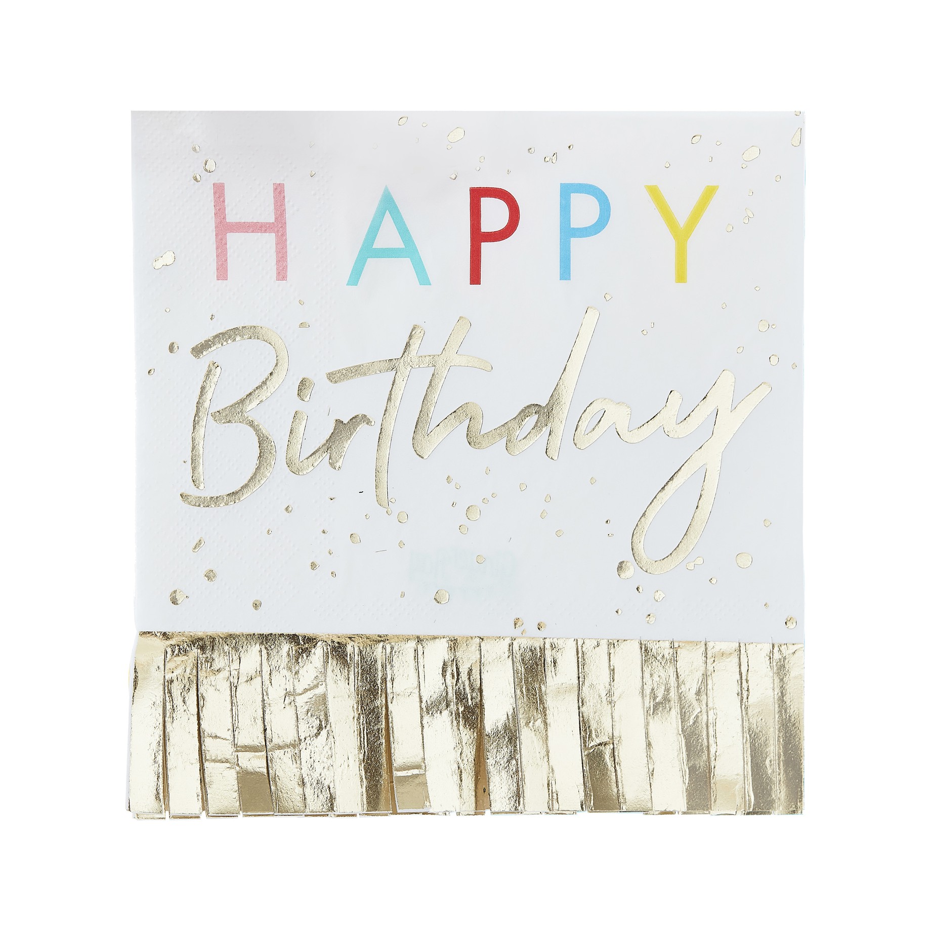 Pack de 16 servilletas de papel estampadas con Happy Birthday en multicolor y dorado y puntitos dorados alrededor, y decoradas con flecos dorados en el borde. Miden 16x16cm