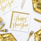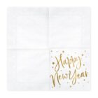 Pack de 20 servilletas de papel blancas estampados con texto Happy New Year en metalizado dorado, miden 33x33cm abiertas.