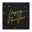 Pack de 20 servilletas de papel negras estampados con texto Happy New Year en metalizado dorado, miden 33x33cm abiertas.