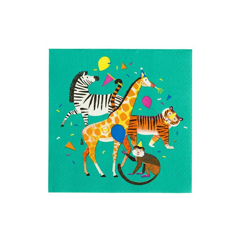 Pack de 20 servilletas tamaño lunch estampadas con dibujos de animales de safari de fiesta sobre fondo verde turquesa. Tienen 3 pliegos que miden 33 x 33cm.