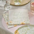 Pack de 16 servilletas verdes con diseño floral y bordes ondulados. Con el texto Hello Baby en color verde.
