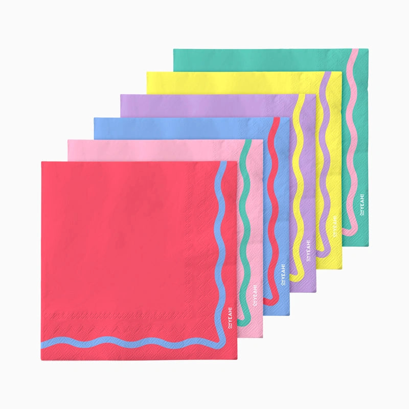 Pack de 20 servilletas en colores multi (rojo, azul cielo, verde, amarillo, rosa y lila), con un línea ondulada en los bordes. Mide 16,5cm.