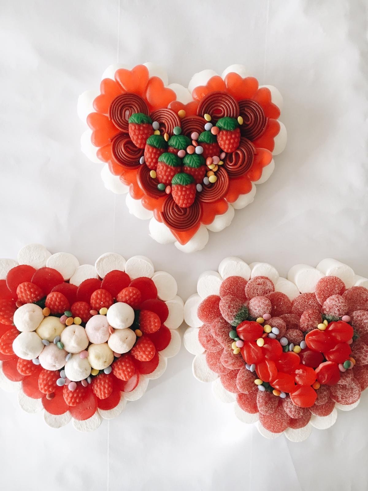 Tarta de chuches, mide aproximadamente 20cm. de diámetro, compuesta por chucherías en diferentes tonos de color.