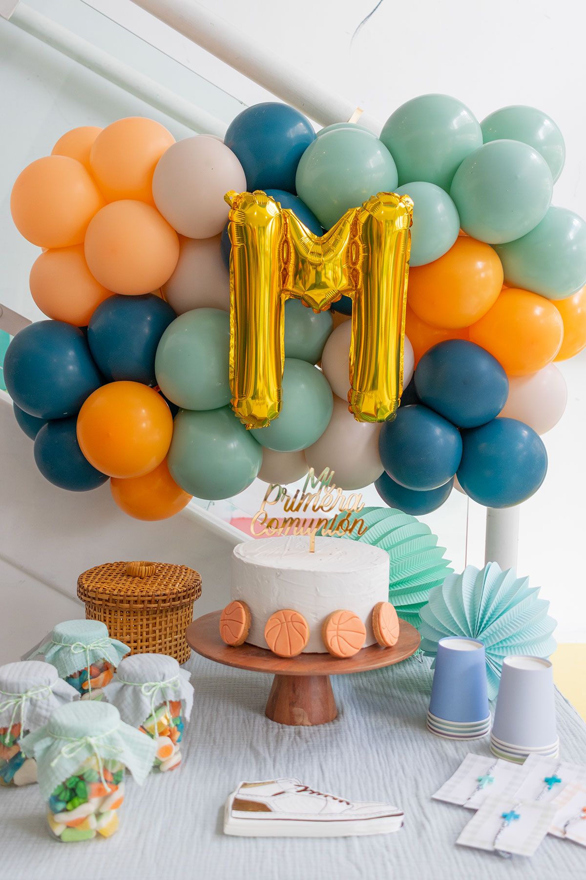 Trasera de globos de látex biodegradable, con una inicial en color dorado, mide 80x60cm aproximadamente. Podrás escoger la combinación que más te guste, la de la foto es la combi multi azul. Se transporta lista para colgar con 2 cuerdas de cinta.