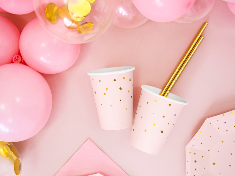 Pack de 6 vasos de cartón de color rosa estampado con estrellas en color oro, tiene capacidad de 260ml