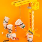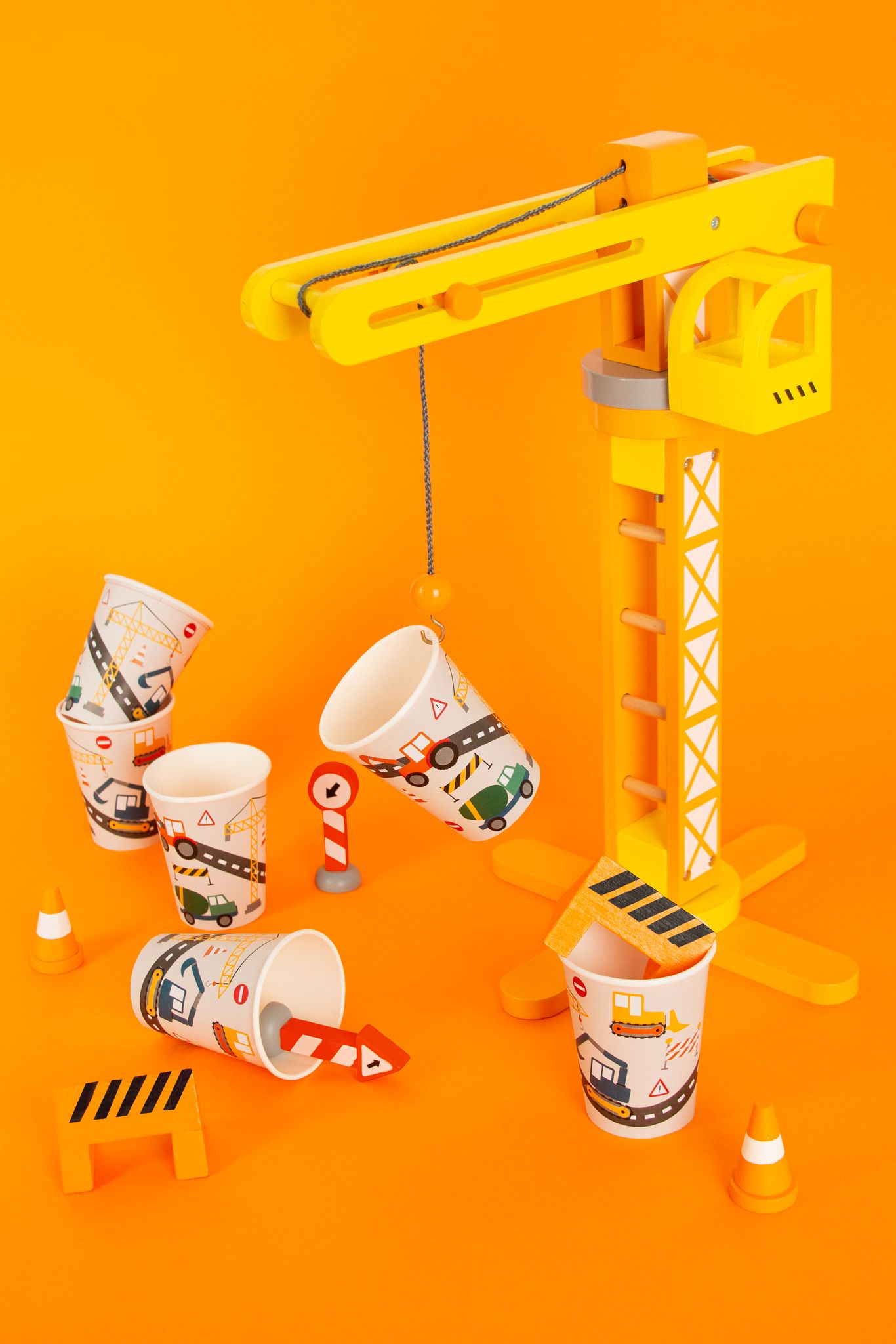 Pack de 8 vasos de papel con estampado de temática de construcción, tienen capacidad para 205ml.