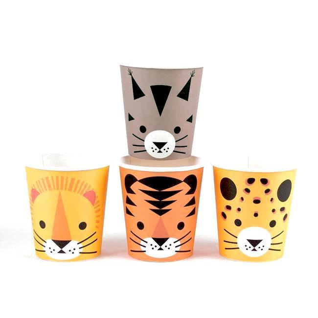 Pack de 8 vasos de papel con 4 modelos de animales de safari diferentes. Mide 8cm. de alto cada vaso.