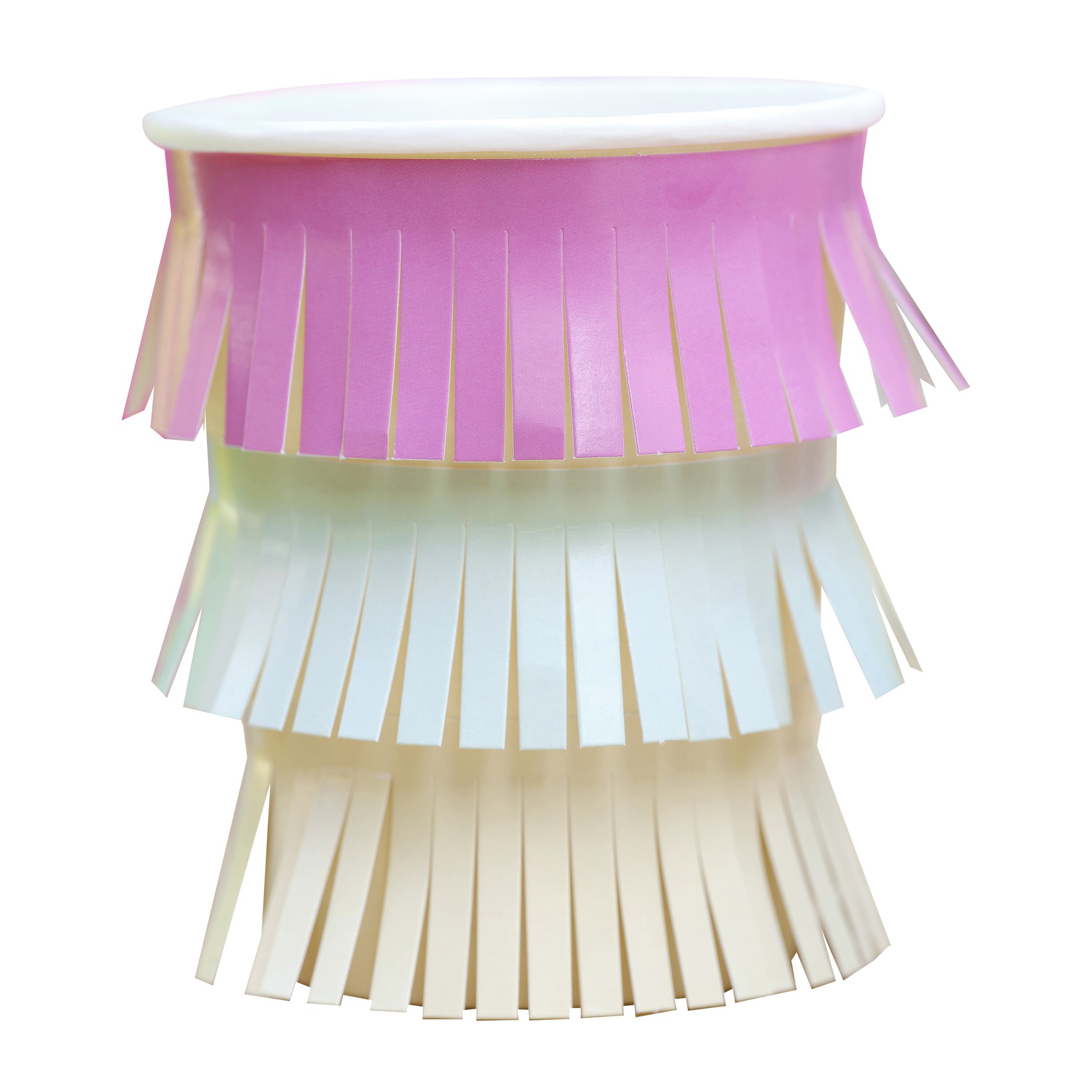 Pack de 8 vasos de papel decorados con flecos multicolor en tonos tropicales.