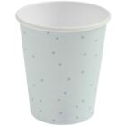 Pack de 8 vasos de cartón de color verde pastel estampado con puntitos en color menta, tiene capacidad de 250ml